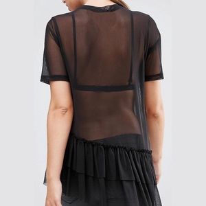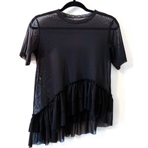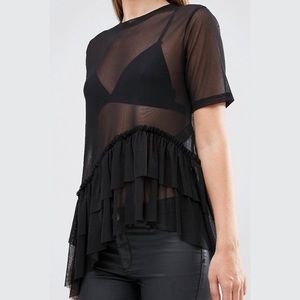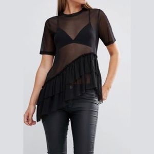 Black mesh/see-through shirt size Small but fits a little loose. Features two layered ruffle rows/tiers and raw hems. Bought online from ASOS. Please ask measurement questions. Btw, label on the neckline showed too much through the mesh material and therefore was cut out. No holes, snags etc. Pre-owned, worn like only once, otherwise is in perfect condition.