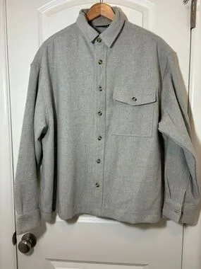 Lightweight shirt-jacket in a neutral gray. Single chest flap pocket with button closure. Button-front opening and classic collar. Relaxed silhouette for easy layering.