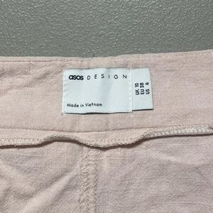 Upgrade your summer shorts collection with these ASOS High Rise Linen Blend Pleated Shorts. The light pink color and solid pattern give them a chic look, perfect for casual outings and travel. The shorts feature a zip closure and slash pockets, making them functional as well as fashionable. Made of a light and breathable blended fabric, they are perfect for summer and spring. These mom-style shorts are machine washable, making them easy to care for. Enjoy a comfortable fit with the regular sizing and pleated front. Shop now and add these EUC shorts to your wardrobe!