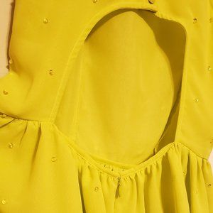 Cute sequin detail skater skirt in a bright yellow-green from ASOS. About 4 sequins have fallen off, as shown in the photos, but the dress is in great shape overall. Very unique color and shape. This was my homecoming dress once many years ago, and has since been in my closet unworn. It has pockets!