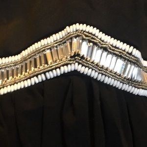 ASOS black maternity dress with gorgeous beading detail. ASOS size US 6 or UK 10. Flattering design for pregnant or postpartum women (though not nursing friendly). ***when I wore this I was about 140lbs/ 8 months pregnant and I am 5’1”. The skirt hits around my knees.