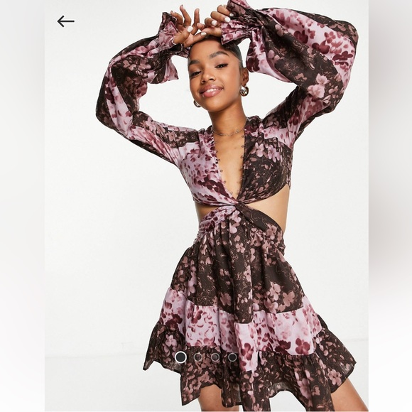 ASOS MINI DRESS FLORAL PRINT, long sleeve, pink, twist front, size US 4, bust 34, worn twice