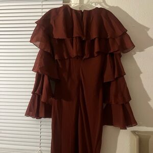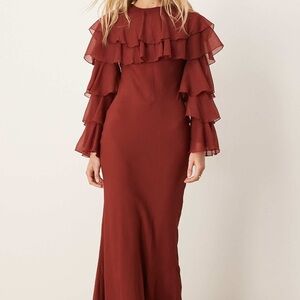 Has never been worn. Chic maroon dress featuring layered ruffles for a romantic, feminine touch. Long sleeves add elegance, making it perfect for any season. Flattering fit works beautifully for weddings, parties, dinners, or any special event.