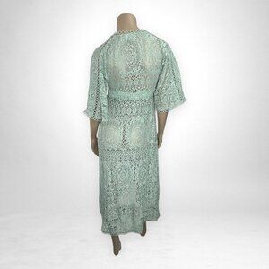 ASOS Maternity dress with a lace, cross-over front. Color is a mint green. See through lace. Wrap dress. ¾ sleeves. Stretchy. V neck. Shorter in front.