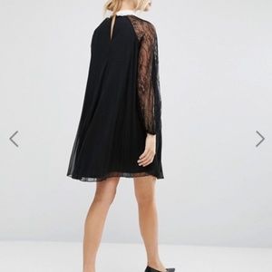 Elegant black mini dress. Features lace sleeves and white collar. Perfect for maternity wear.