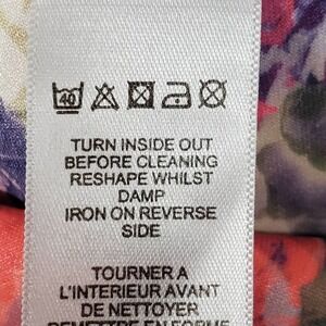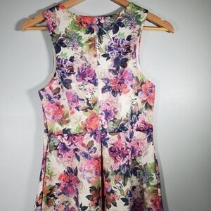 Features : sleeveless, allover pink and purple floral pattern, cream background, scuba material, center and princess seams on bust, stretchy, raw bottom hem, A-line skater skirt, maternity, baby shower, spring