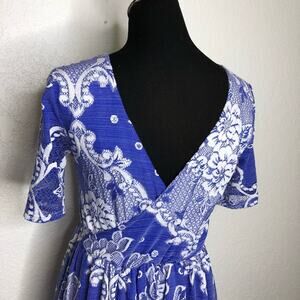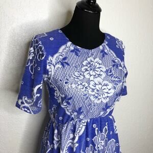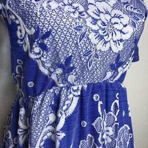 ASOS maternity blue and white floral dress. Pullover style with crew neck line. Crisscross wrap style in back with v back line. Crocheted detail on material. Fully lined except sleeves. Pleated at waist with elastic waistband. Size 4. Excellent pre-owned condition. Nylon polyester blend with polyester lining. Machine wash.