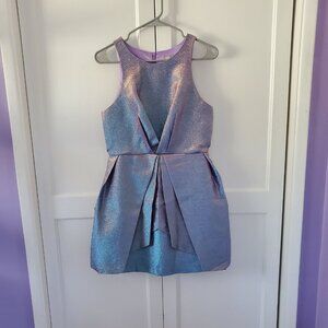 Gorgeous blue/purple metallic dress by Asos. The front top and skirt portions are pleated, it reminds me of a tulip. Would love to keep it, but no longer fits. Great for a party dress. Size US 6 /UK 10.