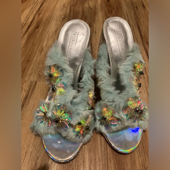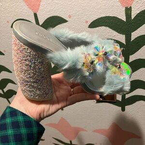Fuzzy Mules with bedazzled flowers