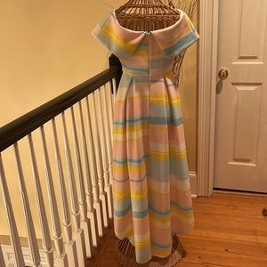 Chic ASOS dress with multicolor stripes. Features off-shoulder design. Perfect for any occasion.