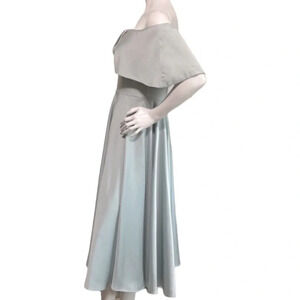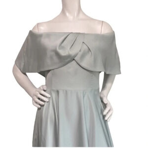 A super chic midi dress in a soft greyed jade with a folded bardot neckline and full floaty skirt. This is a timelessly elegant look you are sure to love!