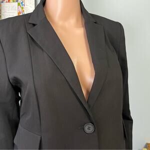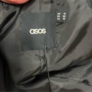 This New With Tags ASOS black blazer is perfect for business, office, or career. Minimalist neutral look that will pair with many different wardrobe choices. 74% polyester, 20% viscose, 6% Spandex for comfortable wear. Fully lined with polyester. Dry clean. Faux flap pockets, one button closure, shoulder pads. Extra button included.