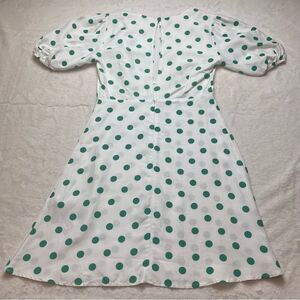 ASOS New With Tags White Green Polka Dot Dress Size 4. Excellent new condition. Puff sleeve dress with a fitted waist and some flare. Large back key hole opening with one button at neck and a zipper near waist. 86% viscose, 14% linen. Very small mark on front as shown in photo. Measures chest 32”, length 33”, sleeve 10”.