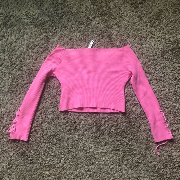Size US 4/ best fits XS-Small. NWT/Tags still attached. Hot pink colored ribbed stretchy material. Has lace up sleeve details and off the shoulder neckline. Cropped fit! Perfect condition, No flaws or defects.