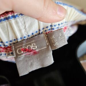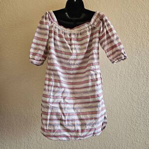 This is a mini dress by ASOS.  It has an elastic neckline, and though it is meant to be worn off-shoulder, it is versatile and can be worn on-shoulder, as shown in the photos.  This dress is white with red and blue embroidered details in a stripe pattern.  It has sleeves and pockets.