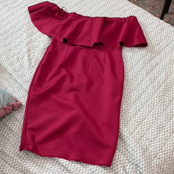 Chic off-shoulder design with ruffle detail. Perfect for elegant outings. Flattering midi length. Worn twice. Dry-cleaned with tags.