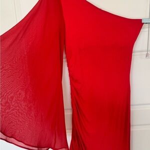 Gorgeous one shoulder dress with sheer waterfall sleeve!