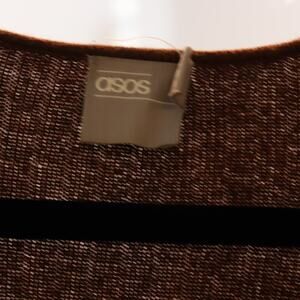 Cozy and versatile oversized knit by ASOS in a warm brown shade. Features a deep V-neckline, draped silhouette, and side openings that can be styled with a belt for a cinched look. Perfect for layering in cooler weather.
