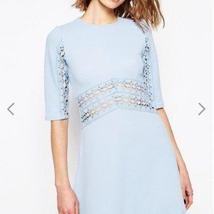 Like new, Pale blue skater dress size 2. This dress has beautiful lace detail along the waist and inner sleeves.