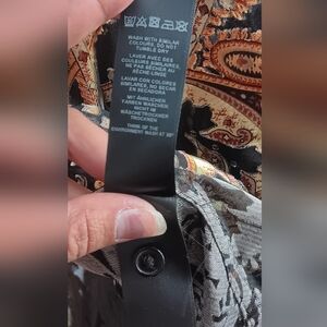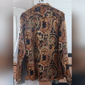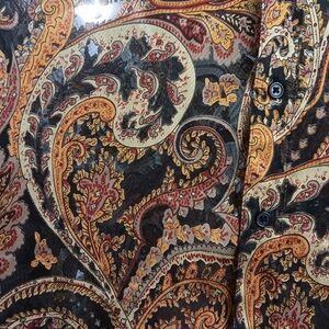 Stylish top with intricate paisley design. Features a blend of black, orange, and tan hues.