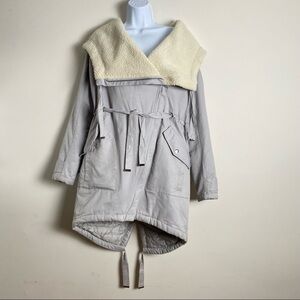 Light Grey parka stylish over the shoulders hood/collar. Waist adjustable with strap. Length is above the Knees. Rarely use is an good condition