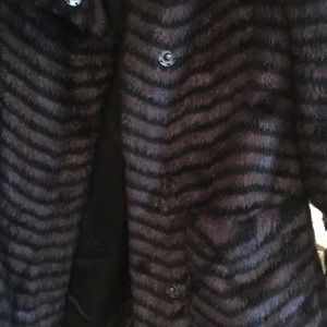 Previously LOVED for the past two winters. Dark purple and black striped faux fur coat that will keep you warm while standing out. Snap button closures; one is missing a snap (as pictured). Can easily be replaced, but coat still closes all the way with remaining buttons. Two front pockets. High collar. I️ am 5’1” and I️t hits mid thigh. Petite fit so the sleeve lengths and shoulders fit perfectly as other non-petite coats would run large.