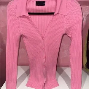 Stylish ribbed sweater. Button-up front. Collared neckline. Long sleeves.