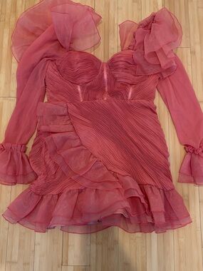 Feminine pink mini dress with layered ruffle sleeves. Fitted bodice with subtle corset-style seaming. Flared ruffled hem for movement. Elegant neckline and long sheer sleeves.