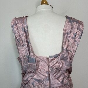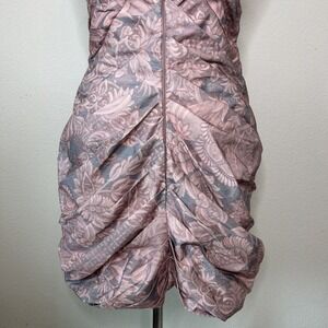 Stunning dress from ASOS. Pink and gray dress with a floral, fruit and almost Grecian type pattern. Crosses over at front skirt. Multiple gathers and pleats. Fun bubble type shape. Rubber lining at chest to help keep it up. Lined. Great dress with so many details and a unique personality! You'll be sure to get compliments! All measurements are approximate, taken flat and closed.