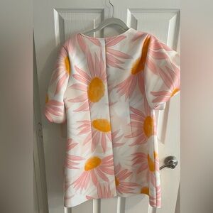 Stylish dress with pink and yellow floral pattern. Features puff sleeves and V-neckline.