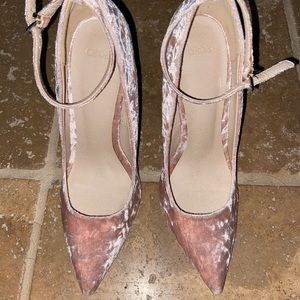 Light pink, suede/velvet heels. Womens size 6 (runs big so fits more like a 6.5). Bought on Poshmark for my wedding, but were too big so I’m selling ): Excellent condition! No original box.