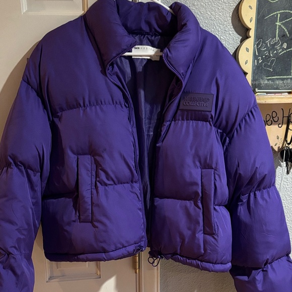 Stylish ASOS puffer jacket. Vibrant purple color. Warm and cozy design.