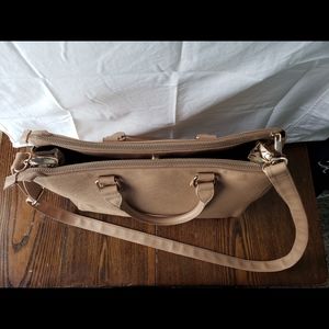 ASOS faux leather purse with removable strap. Strap is adjustable and 47" at its longest length. Handles are 13.5". 2 zip pockets with an interior small pocket in each. Center pocket has a magnetic snap closure. Purse is 13.75" wide and 10.5" tall.