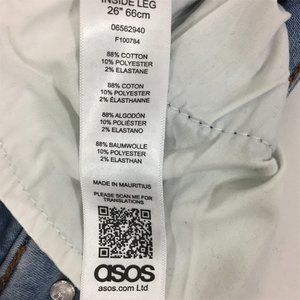 ASOS raw hem cropped jeans. 88% Cotton/10% Poly/2% Elastane. Machine wash. Good pre-owned condition. Marked size 32/26, but inseam measures 22.5".