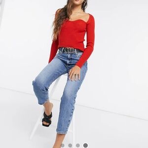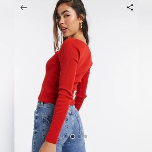 Stylish red ribbed blouse. Long sleeves with a sweetheart neckline. Perfect for casual outings.