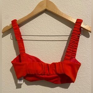 Vibrant red crop top. Features ruched straps. Stylish and bold.