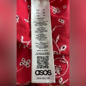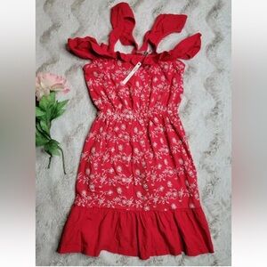 Red mini dress with white floral embroidery; 100% cotton; elastic waist; washed immediately after purchased/unboxed but never worn. Excellent for a casual summer day or for at the beach. Or dress it up for a summer night out. Light and flowy, breathable material.