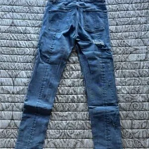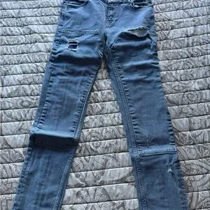 Trendy blue distressed jeans with stylish rips. Perfect for a casual look.