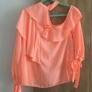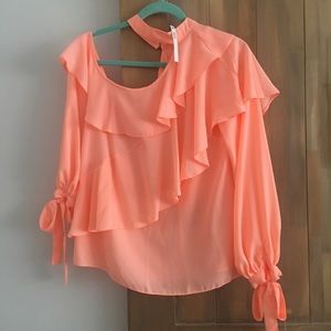 Bright and cheery statement blouse in peach. Features wrap around ruffles and two button closure behind neck. Pretty ribbons adorn the sleeves at each wrist. Suitable for work or play! Brand new with tags, never worn!!