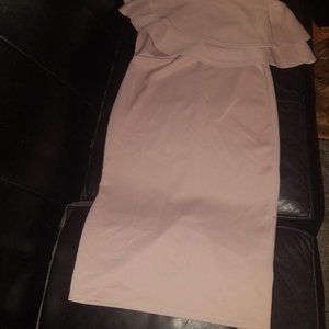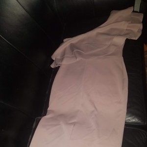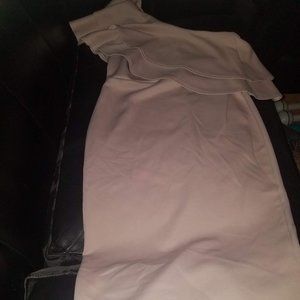 Knee length figure flattering dress. Double ruffle front and back, one shoulder. Left shoulder exposed
