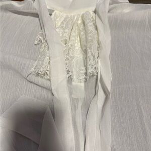 white sheer tie-neck shirt with lace and ruffle details, often referred to as a "pussybow" or "Victorian-style" . It features a high, ruffled collar with a necktie that can be fastened into a bow, and lace trim on the cuffs and placket.