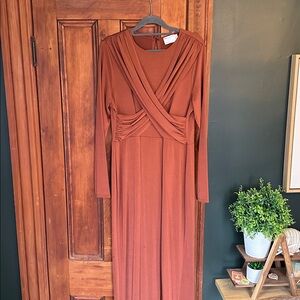 Elegant rust maxi dress. Long sleeves. Fitted silhouette. Perfect for an evening wedding!
