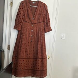 Chic rust midi dress. Features patterned design and button front. Ideal for versatile styling.