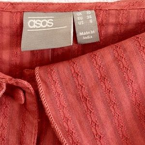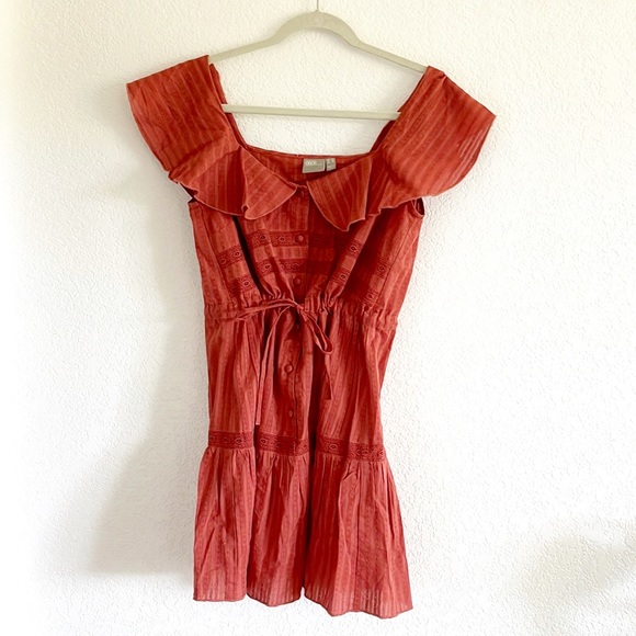 Rust mini with adjustable tie around waist and six buttons that open or close! Love the cut!