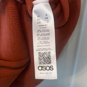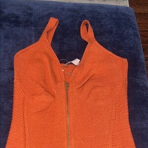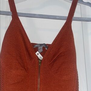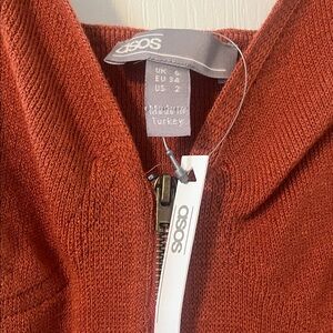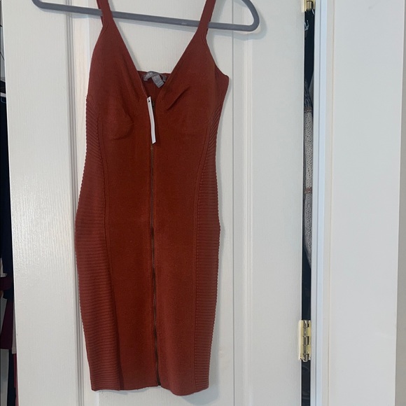 Chic rust mini dress by ASOS. Features a fitted design with ribbed sides. Perfect for stylish outings. Sweater material. Zipper front
