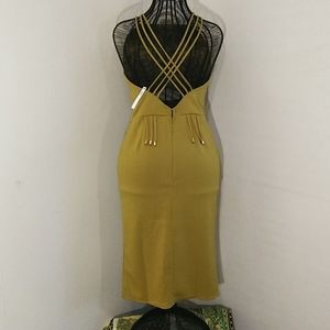 ASOS granny apple green colored multi-strand dress straps criss cross in the back front opening, with two front side splits, hidden zipper and hook back closure, with six extended straps capped off with gold finishing.