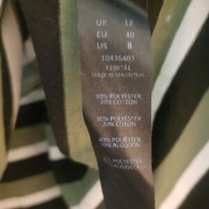 GOOD USED CONDITION STRIPED ASOS DRESS. 3/4 LENGTH SLEEVES. SIZE 8. GREEN/BLACK/WHITE. 80% POLYESTER 20% COTTON.
