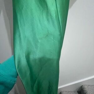 Chic satin midi dress with short sleeves. Flattering silhouette and elegant design. Some minor snags to satin that can be trimmed. Faint stain shown in photo. This garment was never worn and has the tags attached. Obviously I have not tried to clean it yet with the tags still on.