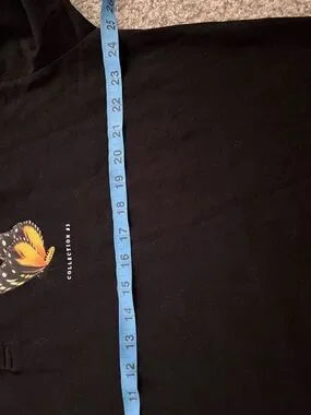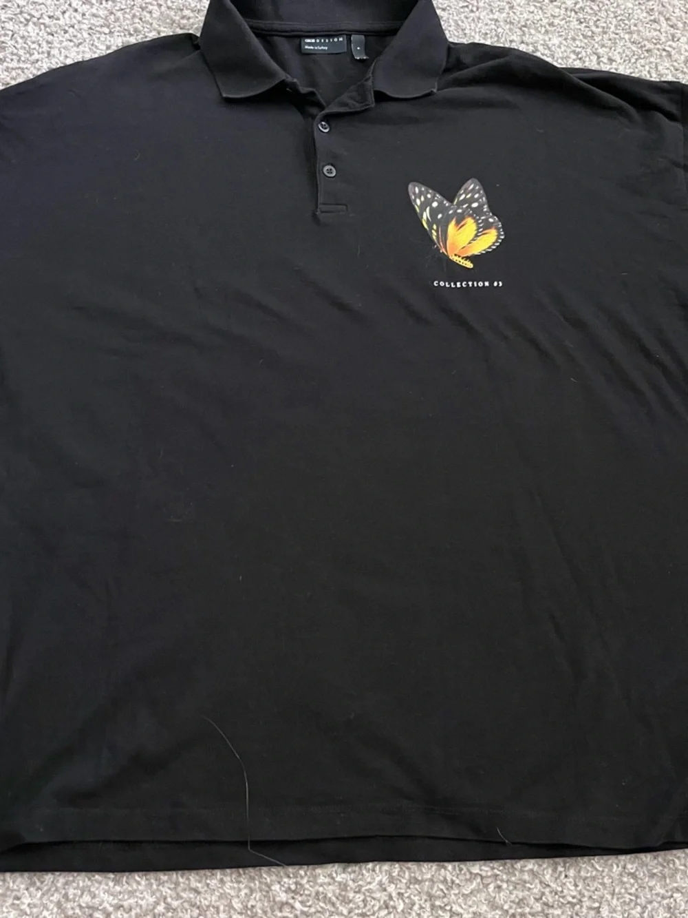ASOS short-sleeve polo. Solid black with a yellow and orange butterfly chest print. Classic three-button placket. Soft, casual style.