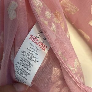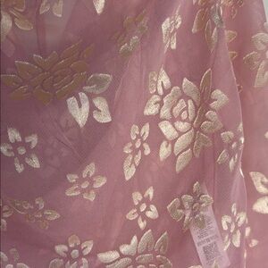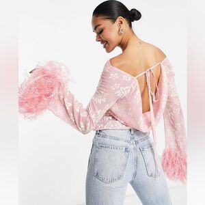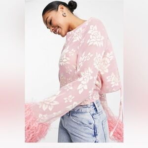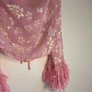 This elegant pink floral top features delicate feathered sleeves, perfect for adding a touch of sophistication to any outfit. Worn once. From non smoking home.